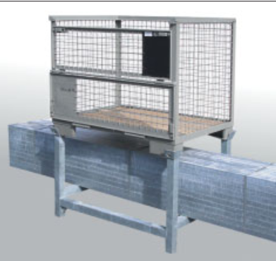 Klecový kontejner splňuje předepsanou evropskou normu a je vhodný především pro vrstvení stavebního materiálu. Výhodou klecového kontejneru je jedna do poloviny sklopná stěna a dřevěné dno. Možná kombinace s paletou pro velké zatížení viz obrázek. Technické parametry klecového kontejneru |